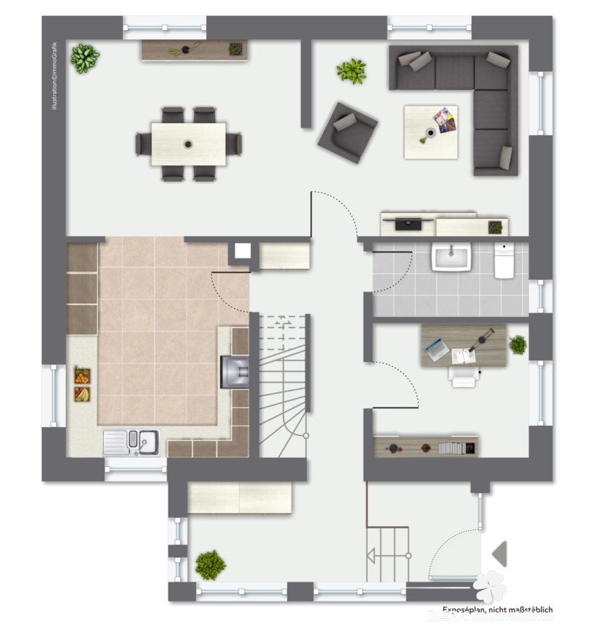 Die Räume sind durchdacht geschnitten, sodass Küche, Wohn- und Essbereich ineinander übergehen und mit dem gemütlichen Kaminofen das Zentrum des Erdgeschosses bilden. Der Eingangsbereich wurde mit einem nachträglichen Anbau erweitert um dann einen großzügigen Eingangsbereich mit Platz für Garderobe und Co zu gewährleisten. Gäste-WC und ein Büro runden das Erdgeschoss ab.