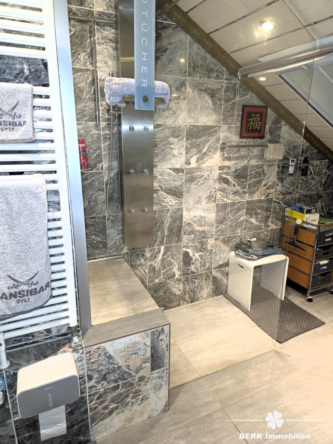 Zu den Ausstattungsmerkmalen zählen unter anderem ein großzügiger Wohn- und Essbereich mit Kachelofen im Erdgeschoss, zwei Küchen mit Einbauküchen, ein modernisiertes Badezimmer im Dachgeschoss mit bodentiefer Dusche und Fußbodenheizung sowie Klimaanlagen in Wohn- und Schlafzimmer. Kunststofffenster mit Doppelverglasung wurden im Zeitraum von ca. 2005 bis 2007 erneuert.