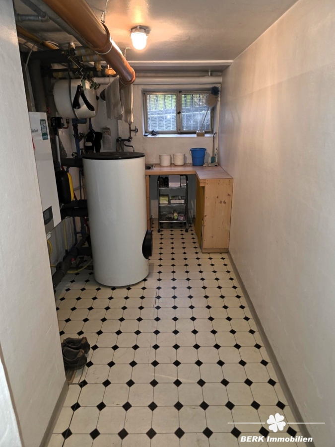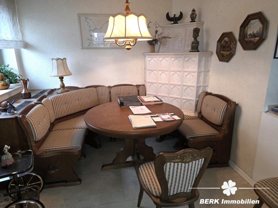 Im Erdgeschoss erwartet Sie ein großzügiger Wohn- und Essbereich mit gemütlichem Kachelofen, eine Küche mit Einbauküche, ein Tageslichtbad mit Wanne und Dusche sowie ein separates Gäste-WC. Von hier gelangen Sie direkt auf die sonnige Terrasse und in den liebevoll angelegten Garten mit Teich und Bachlauf. Zusätzlich bietet der wohnlich ausgebaute Keller weitere vielseitig nutzbare Räume.