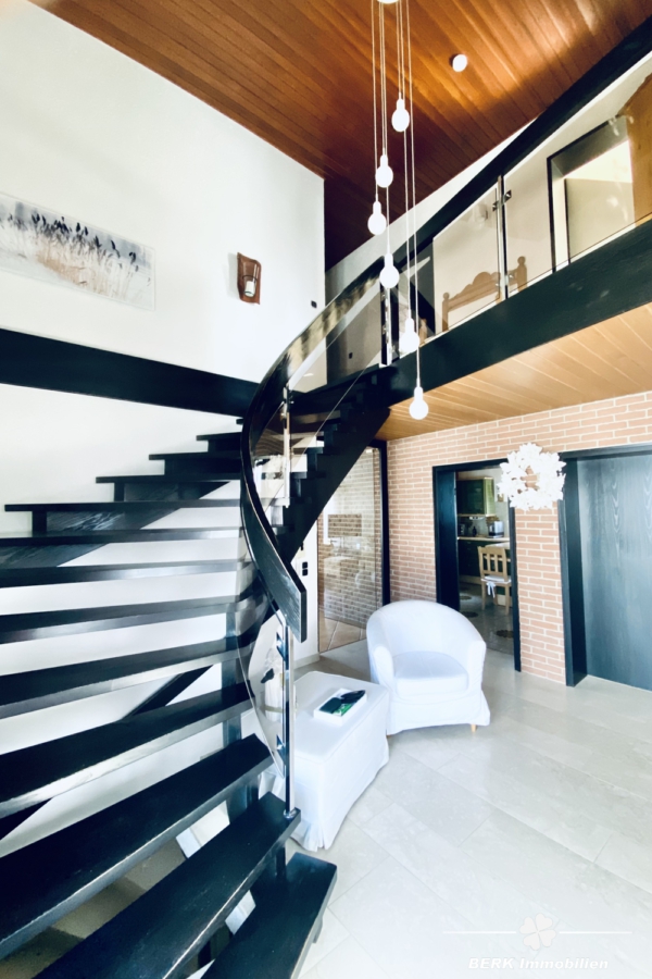 Bereits beim Betreten empfängt Sie ein weitläufiger Eingangsbereich mit luftiger Raumhöhe und einer elegant geschwungenen Treppe aus hochwertigem Eschenholz, die in die oberen Ebenen führt.